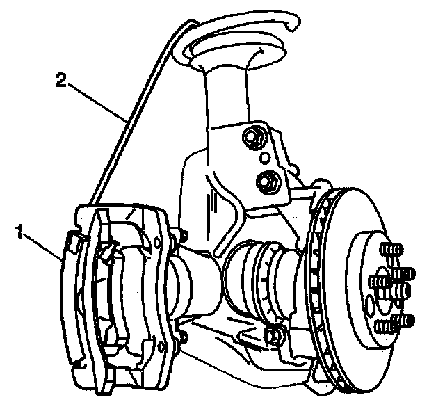 7. Remove the brake caliper and the caliper mounting bracket as an assembly (1) from the suspension knuckle and support the assembly with heavy mechanic's wire (2), or equivalent. Ensure that there is no tension on the hydraulic brake flexible hose.