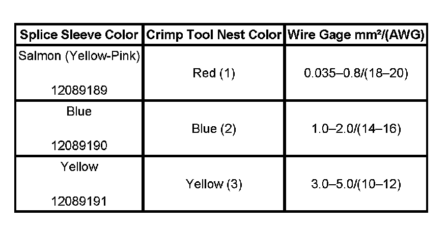 4. Select the proper duraseal splice sleeve according to the wire size. Refer to the above table at the beginning of the repair procedure for the color coding of the duraseal splice sleeves and the crimp tool nests.