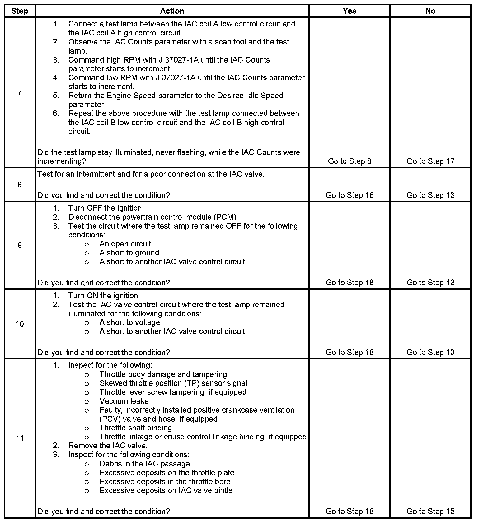 7. This test will determine the ability of the PCM to provide the IAC control valve circuits with a ground. On a normally operating system, the test lamp should not flash while the IAC Counts are incrementing.