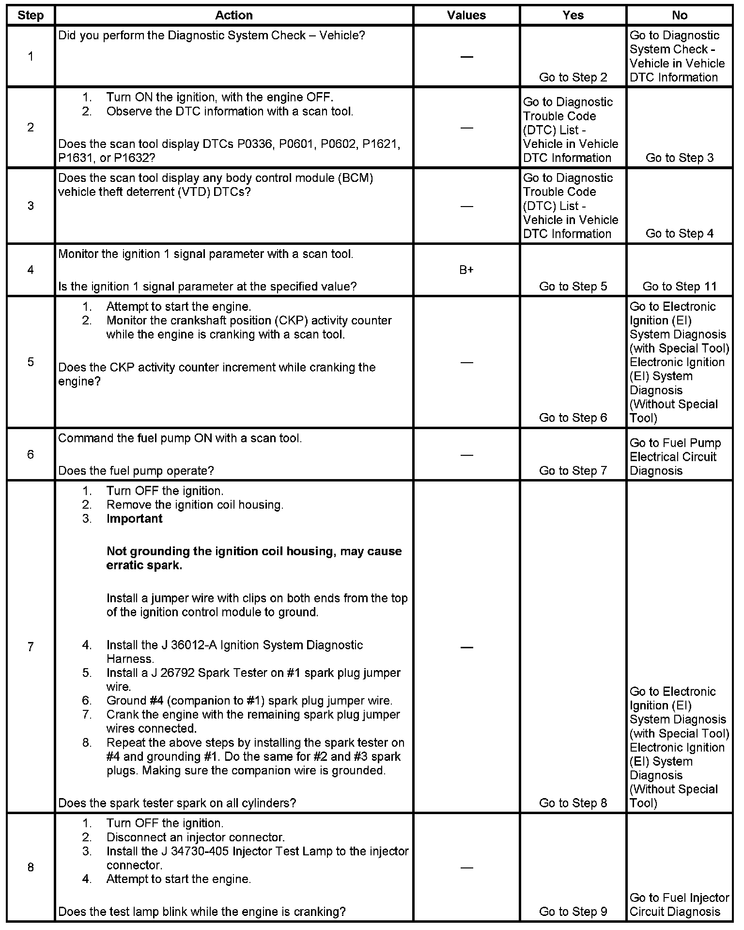The Engine Cranks but Does Not Run diagnostic table is an organized approach to identifying a condition that causes an engine not to start. The Engine Cranks but Does Not Run diagnostic table directs the service technician to the appropriate system diagnosis.