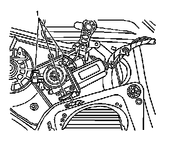 3. Press the front door window motor retaining tabs (1) out to release the front door window regulator motor from the front door system locking module.