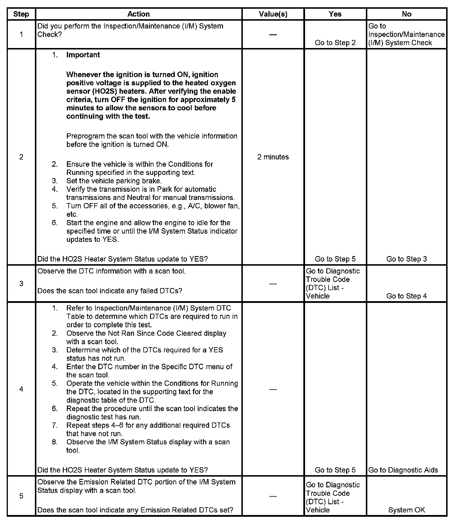 The purpose of this procedure is to satisfy the enable criteria necessary in order to execute the inspection/maintenance (I/M) readiness diagnostics for the Heated Oxygen Sensor (HO2S) Heater System. Ensure the vehicle meets the requirements listed in Conditions for Running before performing this test. Failure to meet the necessary requirements may produce inaccurate test results.