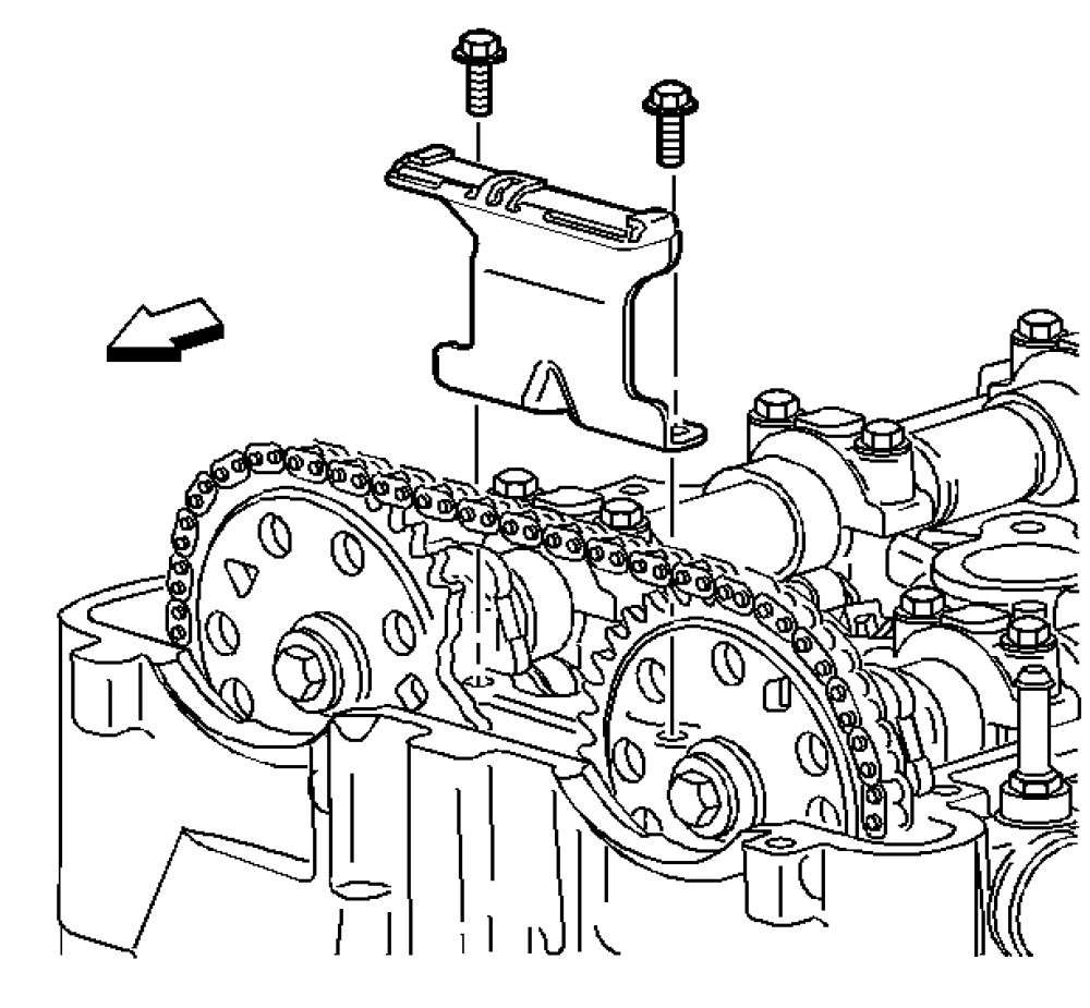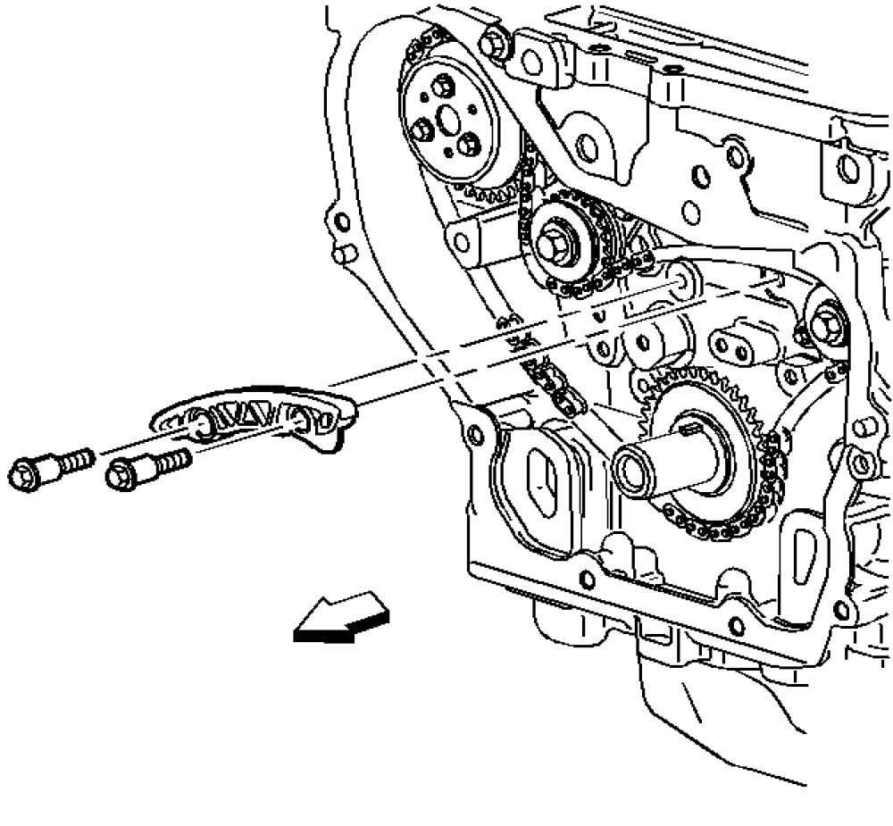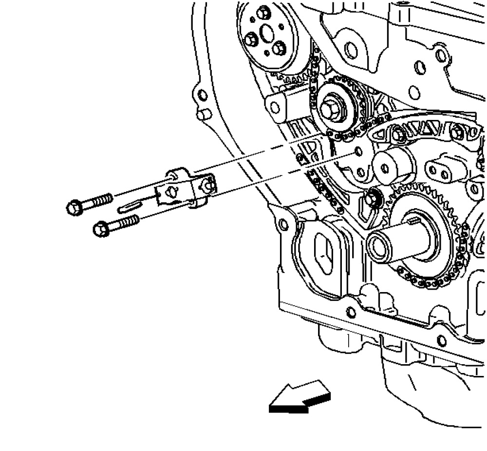 Important: The timing chain tensioner must be removed to unload chain tension before the timing chain is removed. If not removed, the timing chain will become cocked and it will be difficult to remove.