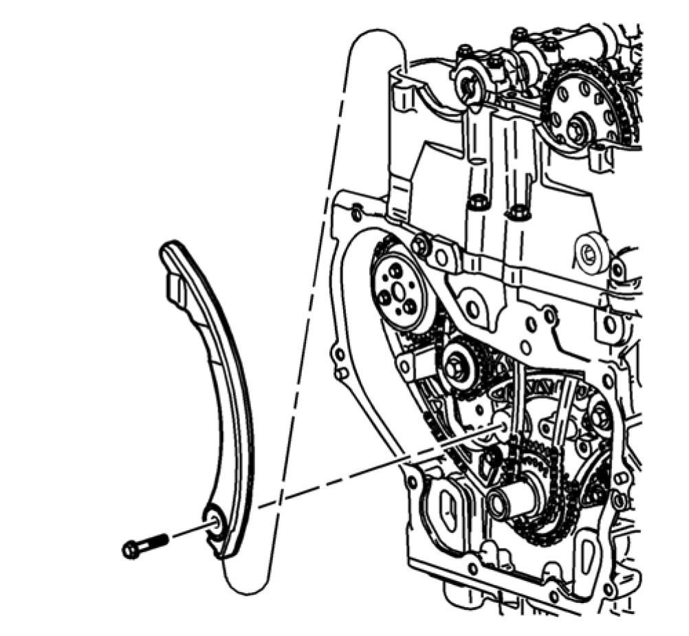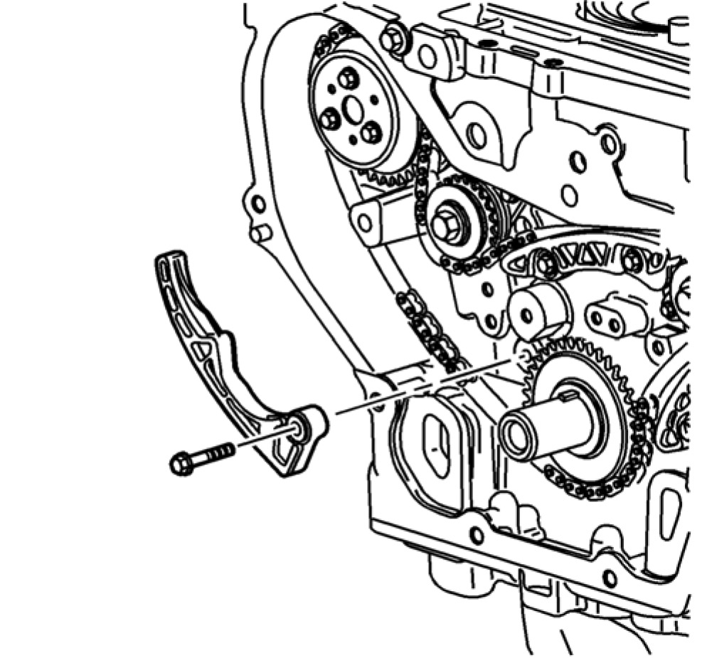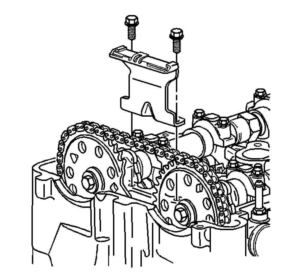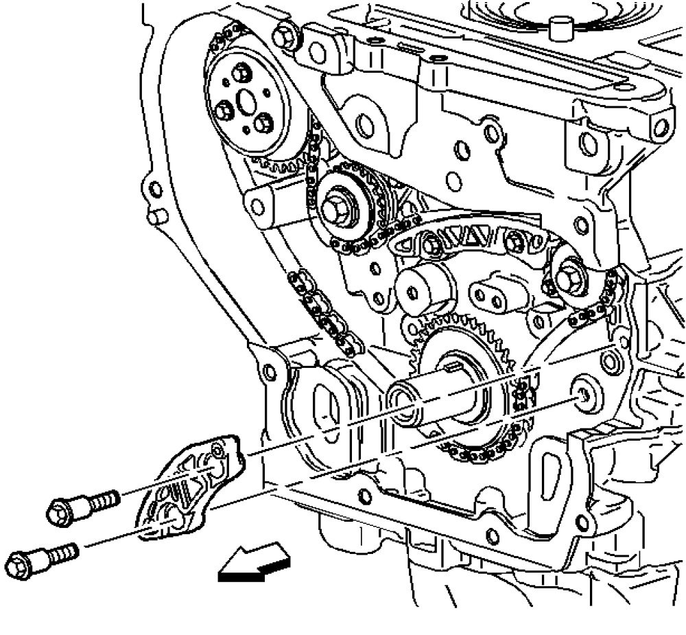 Important: The timing chain tensioner must be removed to unload chain tension before the timing chain is removed. If not removed, the timing chain will become cocked and it will be difficult to remove.