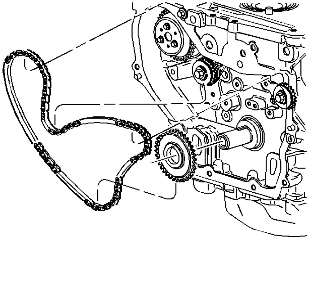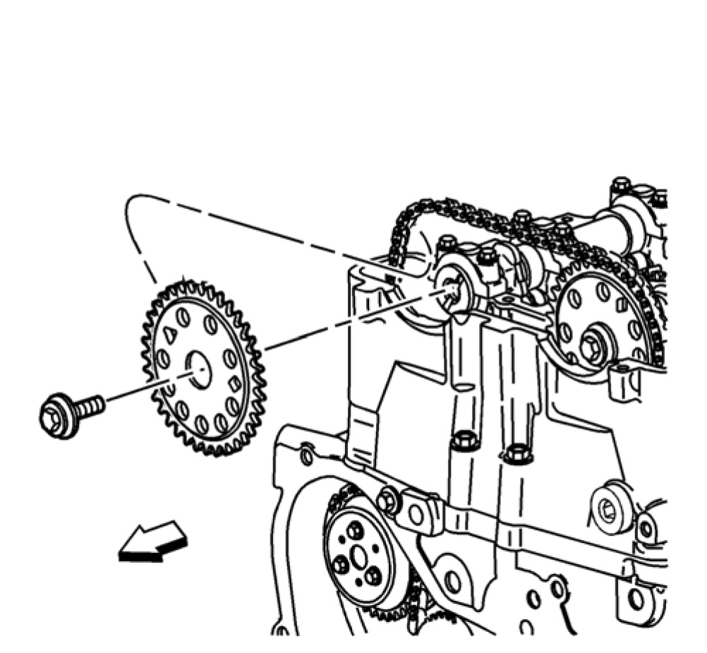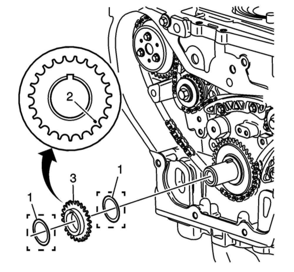 Note: Ecotec 4 cylinder engines with SIDI-Direct Injection, the lower timing chain crank gear may be equipped with a second spacing washer installed in front of the lower timing chain crank gear. The outer spacer/washer is in between the crank/balancer pulley and the lower timing gear and may remain in place when the pulley is removed. The spacer/washer has a dot/mark on its surface that may be mistaken for the lower timing mark. If applicable, the washer must be removed in order to view the correct timing mark on the lower crank gear.