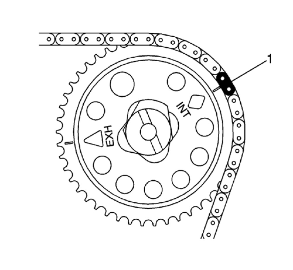 18. Route the timing chain around the intake camshaft sprocket with the uniquely colored link (1) aligning with the INT diamond.