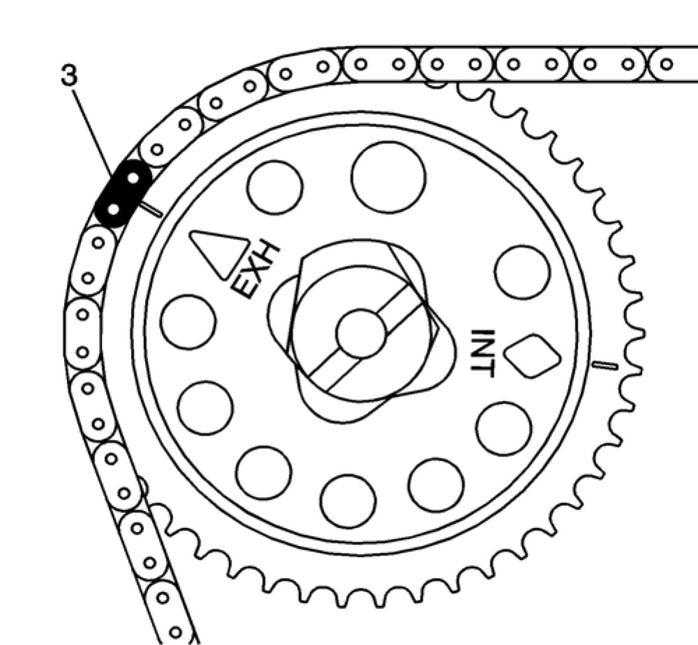 20. Install the exhaust camshaft sprocket with the timing chain matching colored link (3) at EXH triangle aligned at the 10 o'clock position.