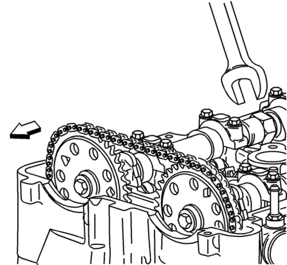 11. Use a 24 mm wrench to hold the camshafts from turning.