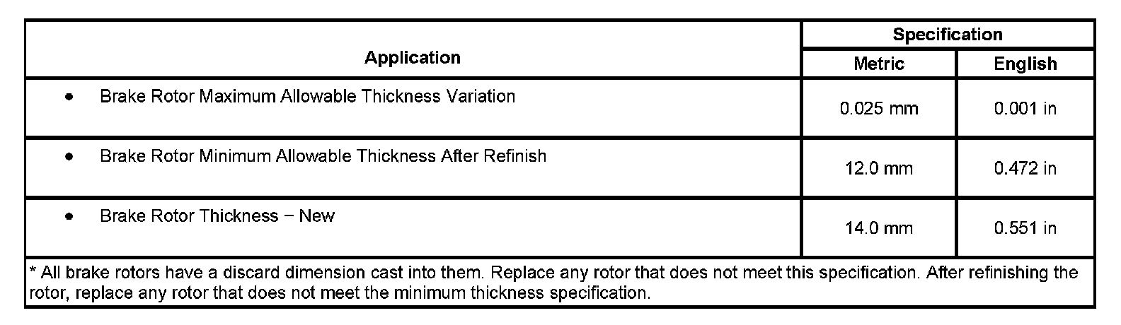 Disc Brake Component Specifications: