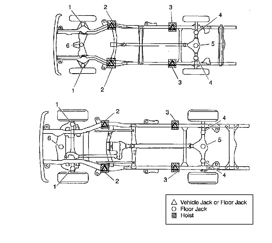 The jack and hoist lift points for the front of the vehicle are located between the front body mounts and the transmission crossmember. The jack and hoist lift points for the rear of the vehicle are located at the front hangers for the rear springs.