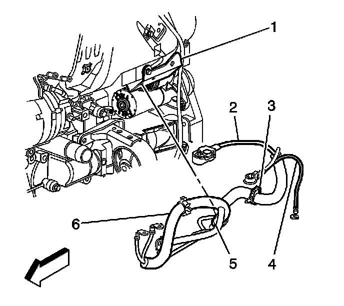 6. Insert the battery positive cable (4) into the upper portion of the battery cables harness conduit (6).