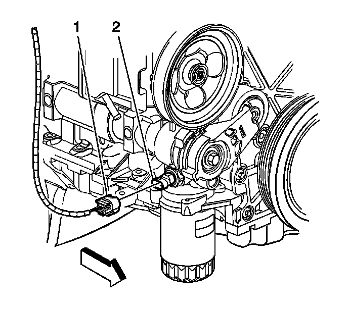 2. Disconnect the engine wiring harness electrical connector (1) from the oil pressure sensor (2).