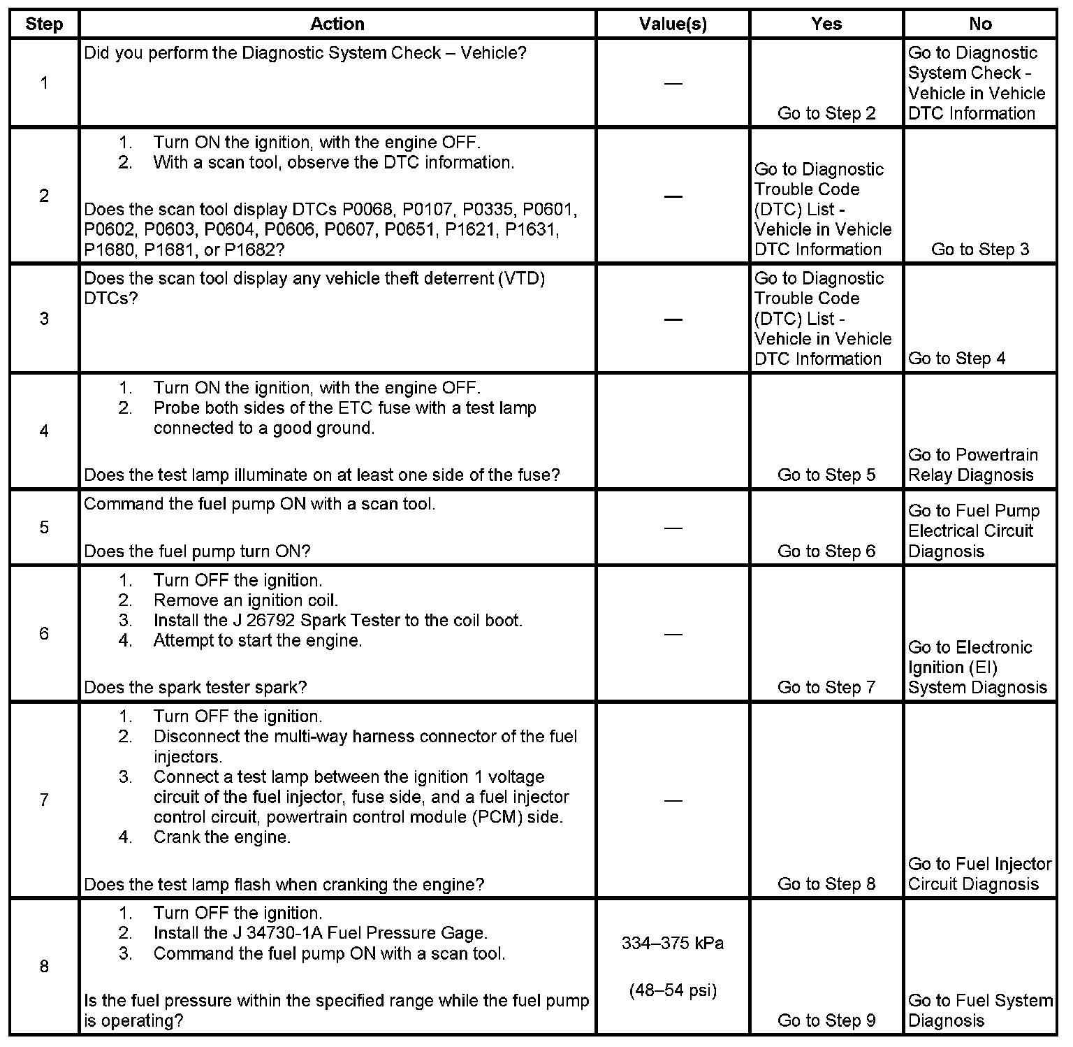 The Engine Cranks but Does Not Run diagnostic table is an organized approach to identifying a condition that causes an engine not to start. The Engine Cranks but Does Not Run diagnostic table directs the service technician to the appropriate system diagnosis.