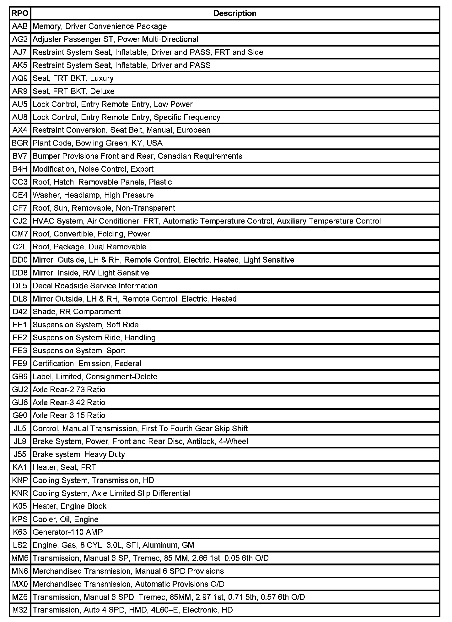 RPO Code List Part 1: