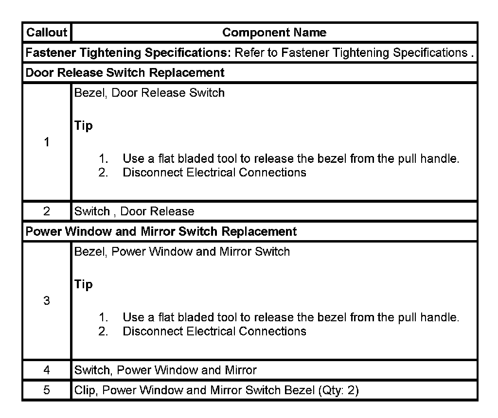 SWITCH AND BEZEL REPLACEMENT - DOOR LATCH RELEASE, POWER WINDOW AND POWER MIRROR - DRIVER DOOR