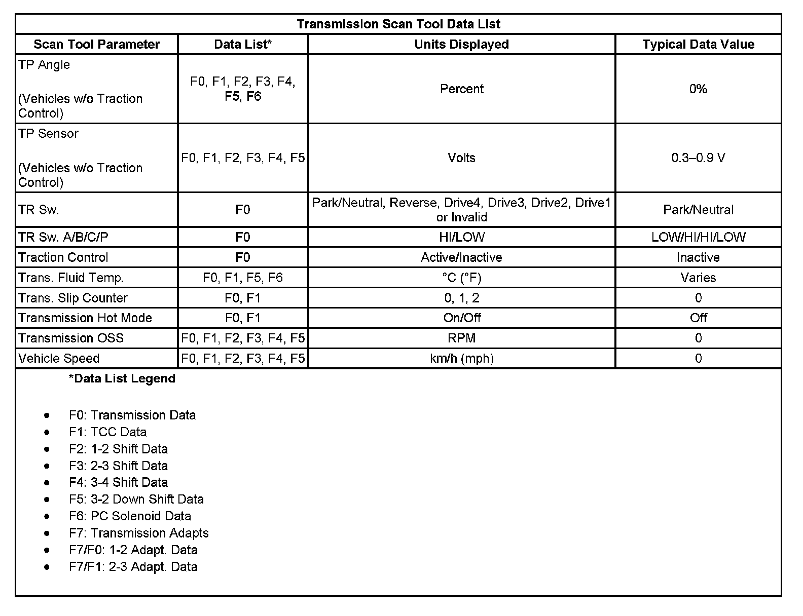 Only the parameters listed below are used in this manual for diagnosing. If a scan tool displays other parameters, the values are not recommended by General Motors for use in diagnosis.