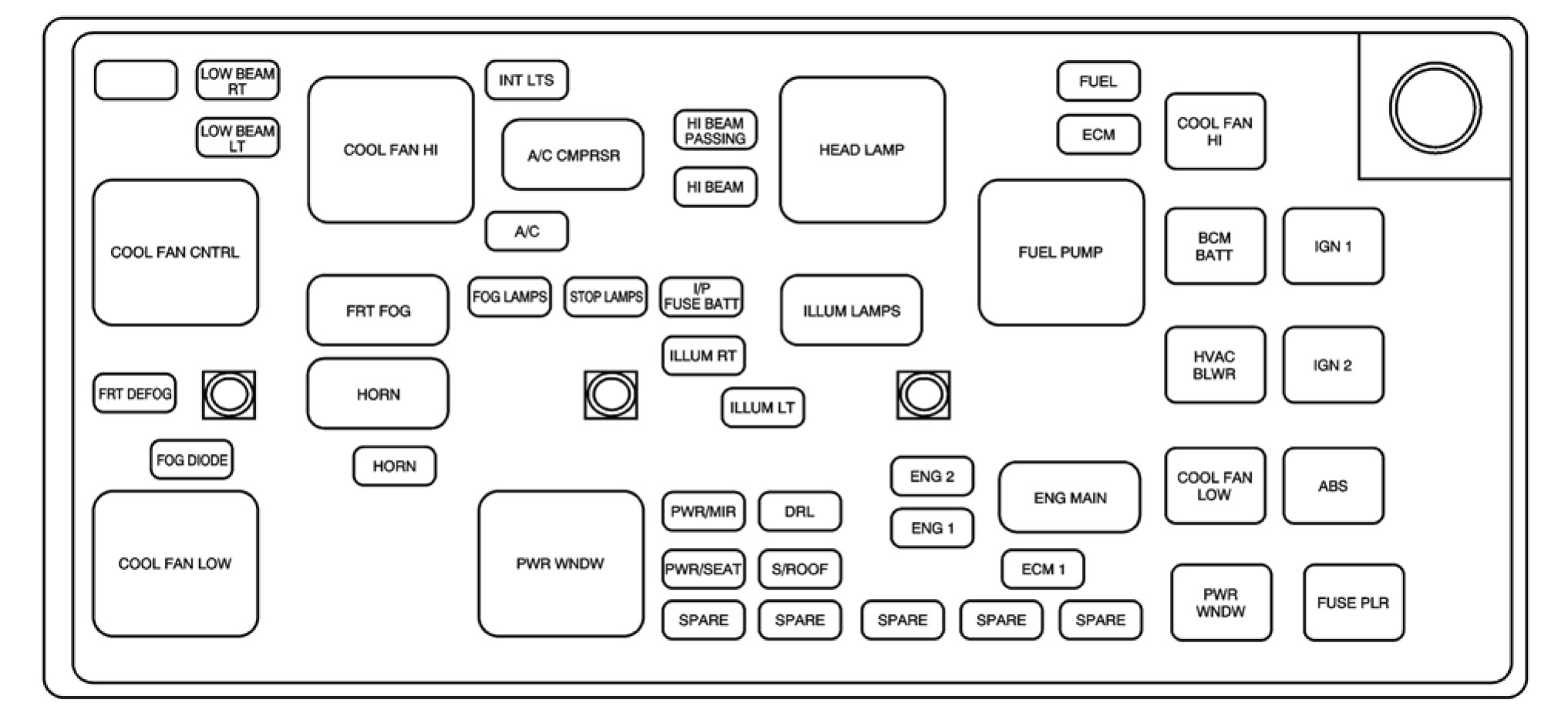 The engine compartment fuse block is located on the driver's side of the vehicle, near the battery. See Engine Compartment Overview for more information on location. To access the fuses, press the top and bottom flaps to release the cover.