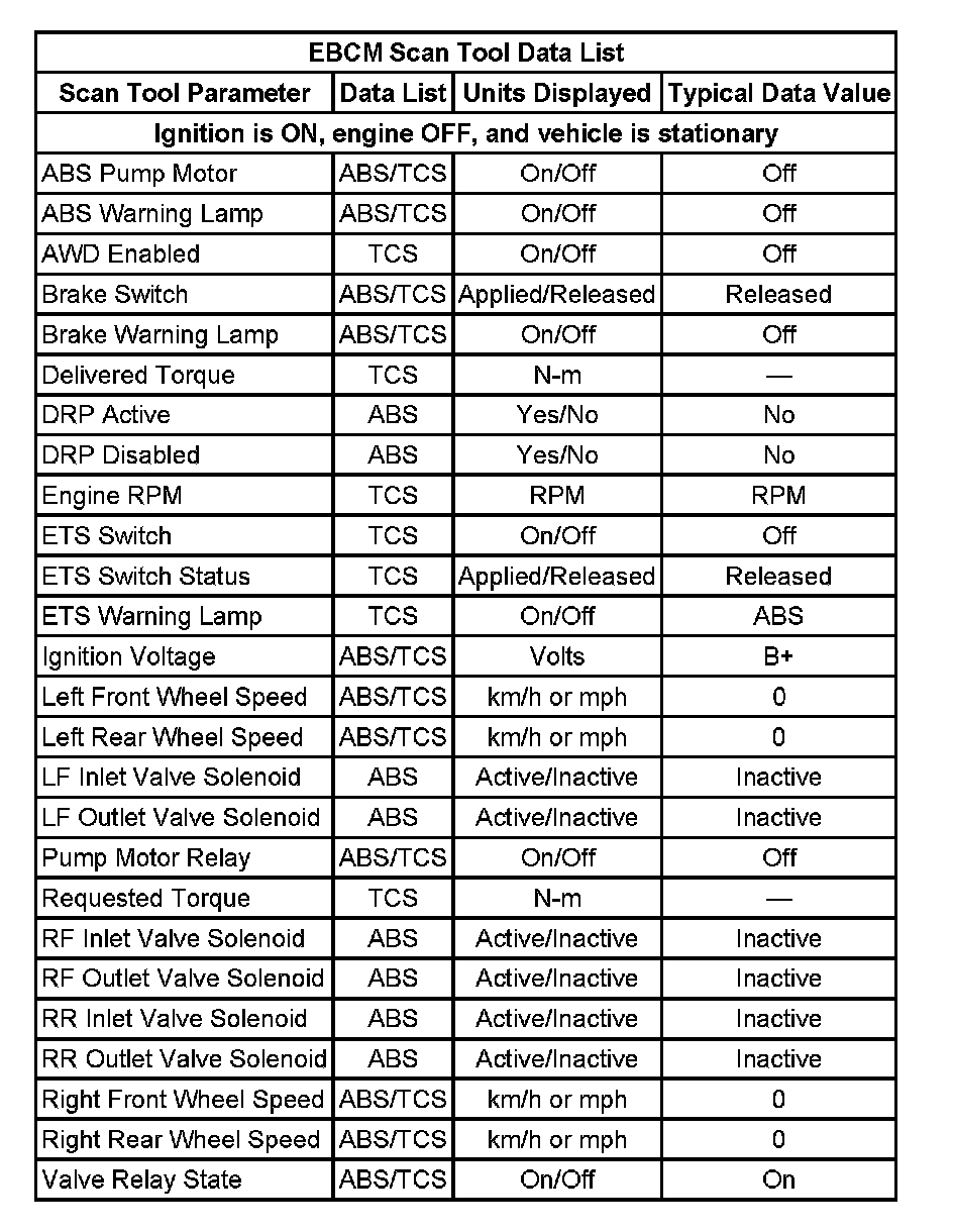 Use the EBCM Scan Tool Data Lists as directed by a diagnostic table or in order to supplement the diagnostic procedures. Begin all the diagnostic procedures with the antilock brake system (ABS) Diagnostic Starting Point. Use the EBCM Scan Tool Data Lists only after the following is determined:
