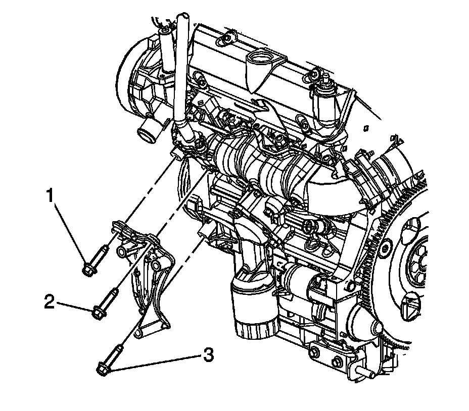 2. Install the compressor mounting bracket bolts (1, 2, and 3) to the engine.