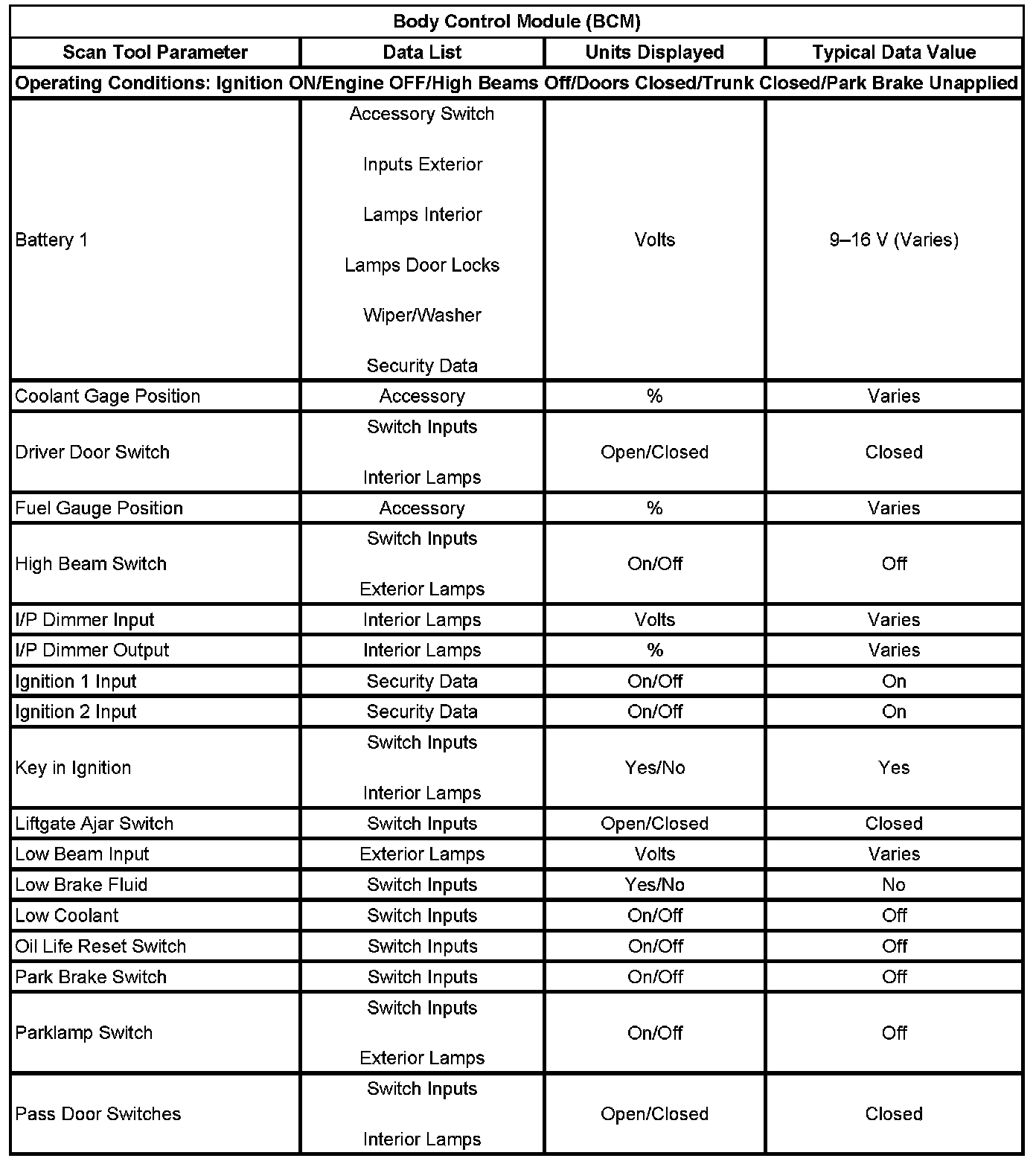 Scan Tool Data List - Body Control Module (BCM)