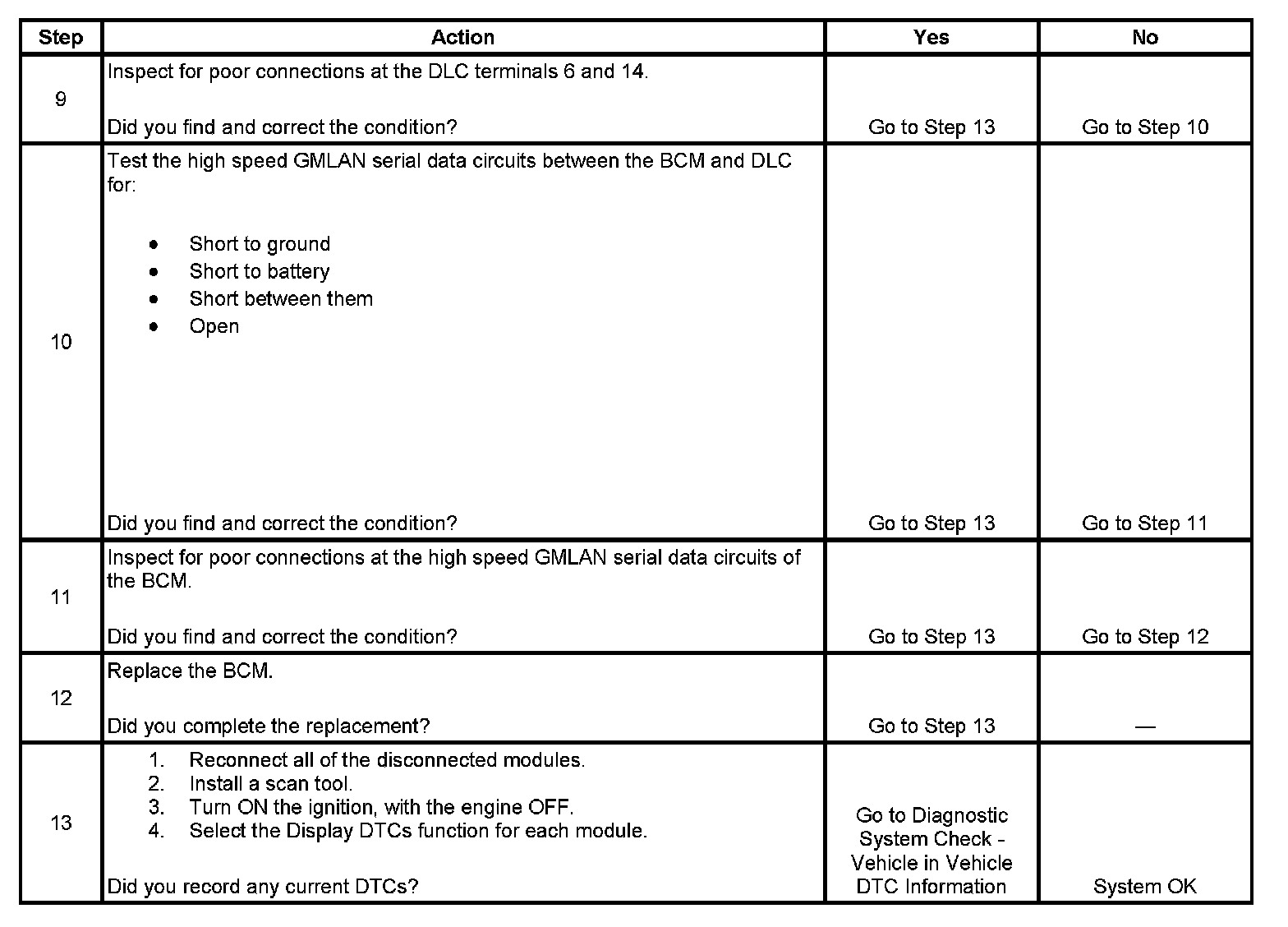Modules connected to the high speed GMLAN serial data circuits monitor for serial data communications on the high speed GMLAN network during normal vehicle operation. Operating information and commands are exchanged among the modules. When a module detects a bus-off condition a DTC U0001, U2100 or U2104 will be set. Generally these DTCs can be retrieved as history only, with the exception of body control module (BCM) that can set DTC U2100 as current, because it communicates with the scan tool on class 2.