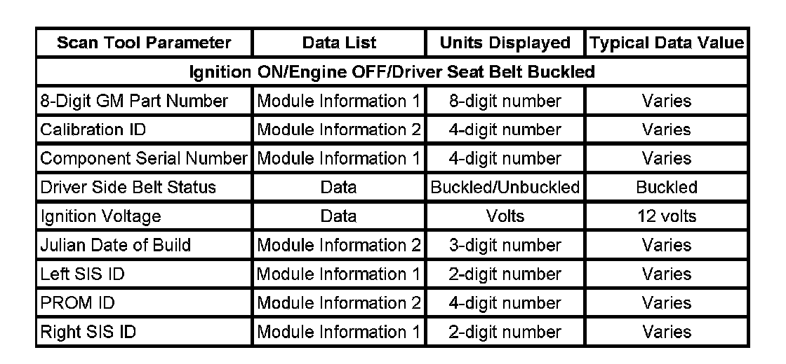 Use the SIR scan tool data list as directed by a diagnostic table or in order to supplement the diagnostic procedures. Begin all of the diagnostic procedures with the Diagnostic System Check - Restraint Systems. Use the SIR scan tool data list after the following is determined: