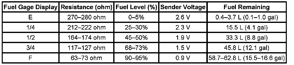 The information in this table is intended for use with the J 33431-C Signal Generator and Instrument Panel Tester. The fuel level sensor values represent the test values to be used on the Signal Generator to drive the fuel gage display to the indicated positions. Vehicles that require more than one fuel level sensor calculate gage position from many possible resistance combinations of fuel levels between the two tanks. Therefore, the values in the table may not correlate directly to readings taken from the vehicle primary or secondary sending units.