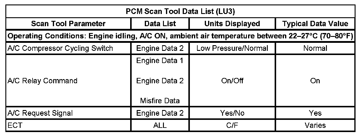 Use the Scan Tool Data Display Values and Definitions Information in order to assist in diagnosing the Powertrain Control Module (PCM) problems. Compare the vehicles actual scan tool data with the typical data display value table information. Use the data information in order to aid in understanding the nature of the problem when the vehicle does not match with the typical data display values.