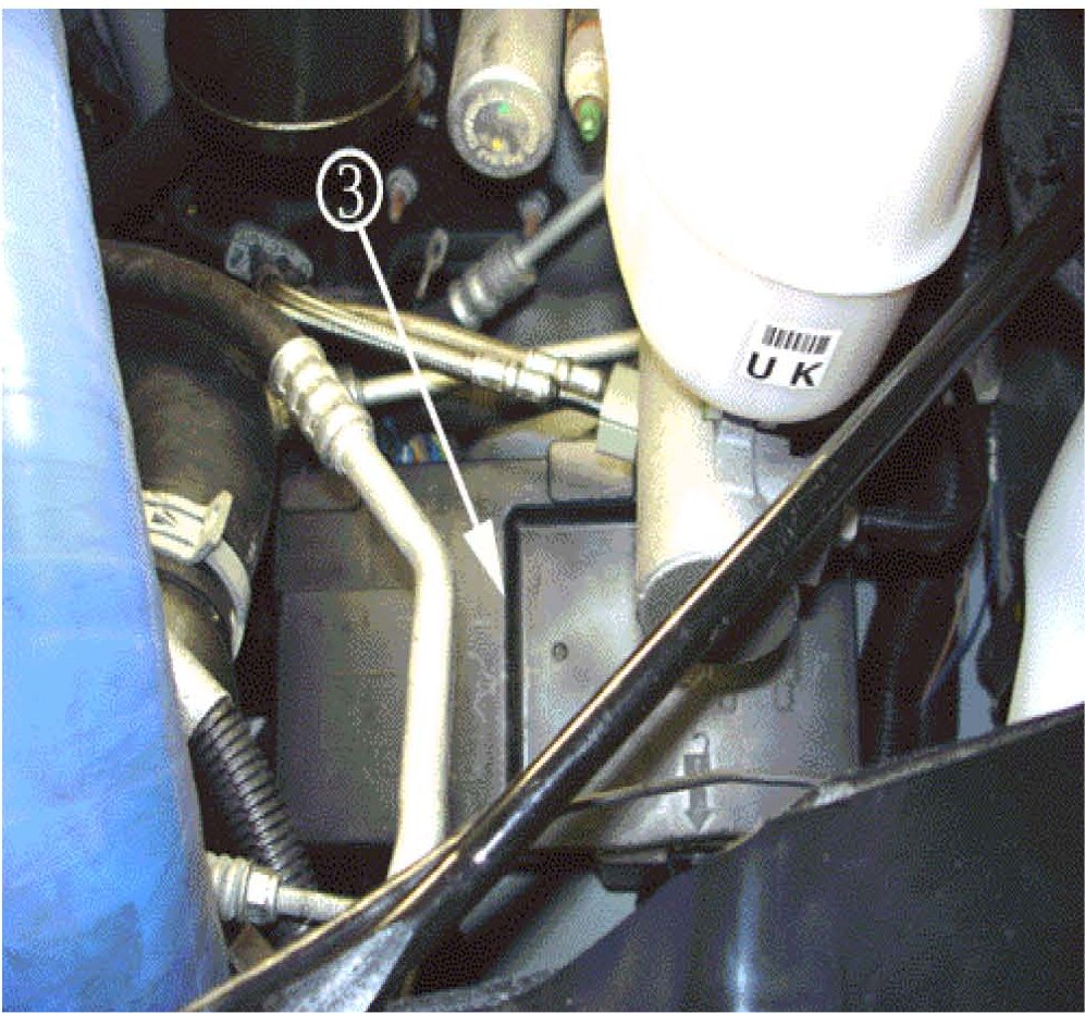 2. The underhood fuse block (3) is located approximately 152 mm (6 in) under the brake fluid reservoir (1) and power steering reservoir (2). The underhood fuse block cover is black and rectangular in shape.