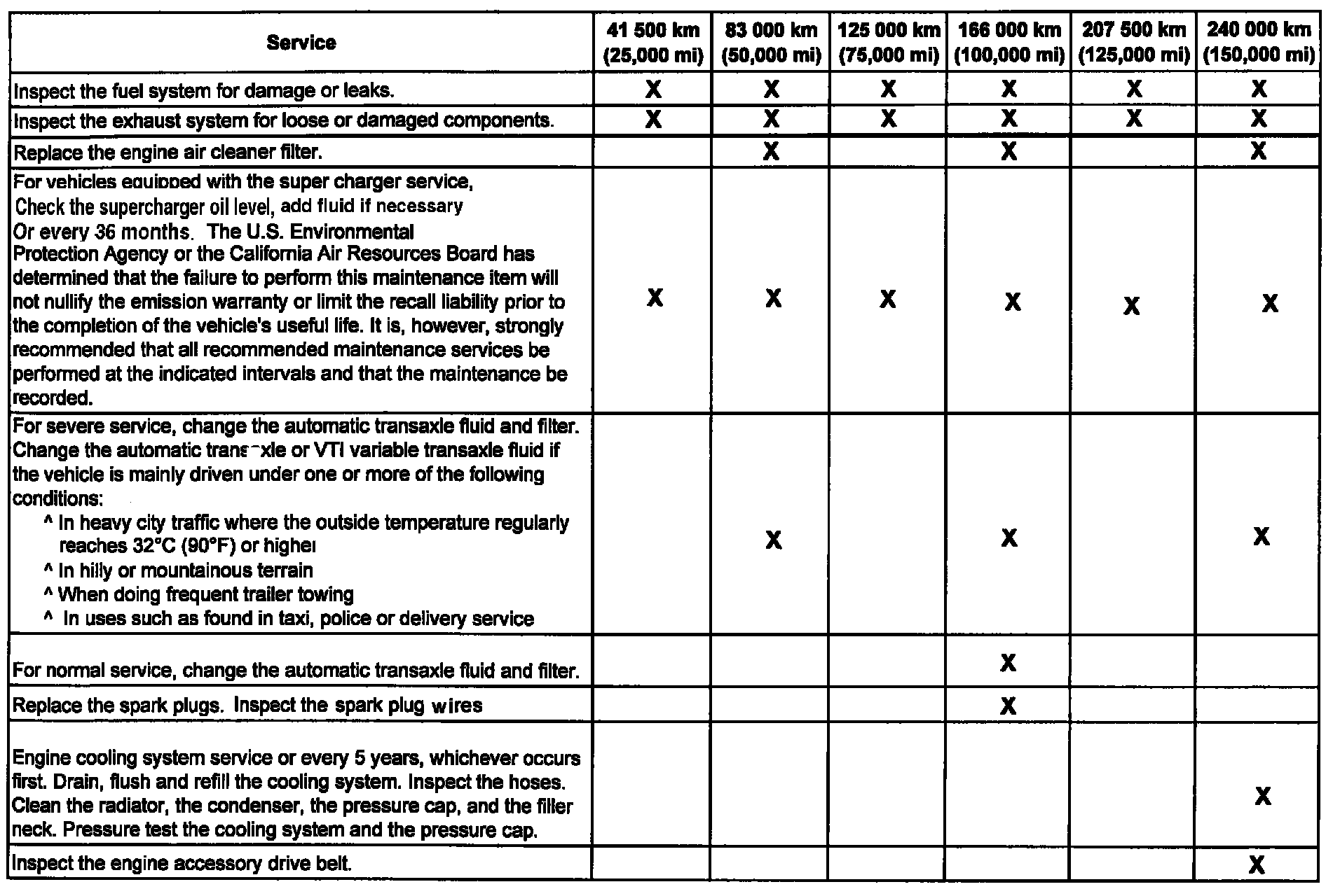 (Maintenance I or Maintenance II) after the indicated kilometers (miles) shown for each item.