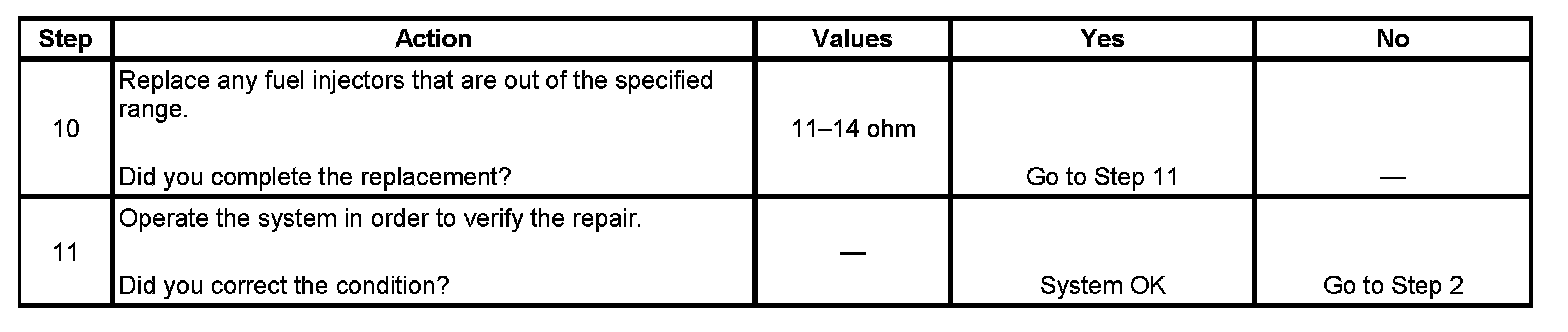 3. This step tests each fuel injector resistance within a specific temperature range. If any of the fuel injectors display a resistance outside of the specified value, replace the fuel injector.