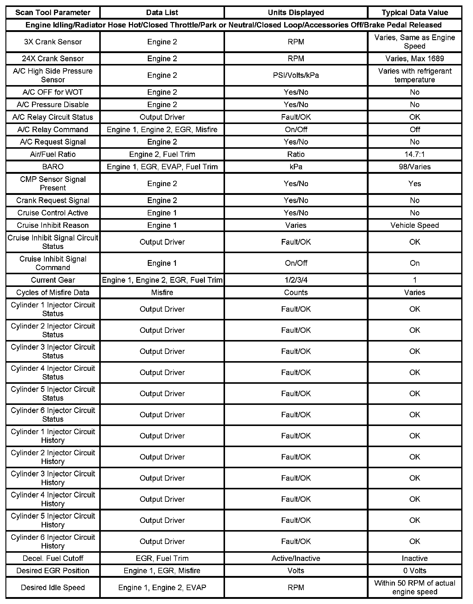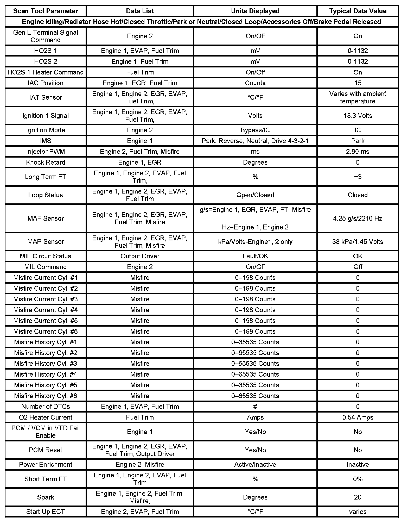 Use the Typical Scan Data Values table only after the Diagnostic System Check-Computers and Control Systems has been completed, no DTCs were noted and you have determined the on-board diagnostics are functioning properly. Scan tool values from a properly running engine may be used for comparison with the engine you are diagnosing. The Typical Scan Data values represent values that would be seen on a normally running engine.