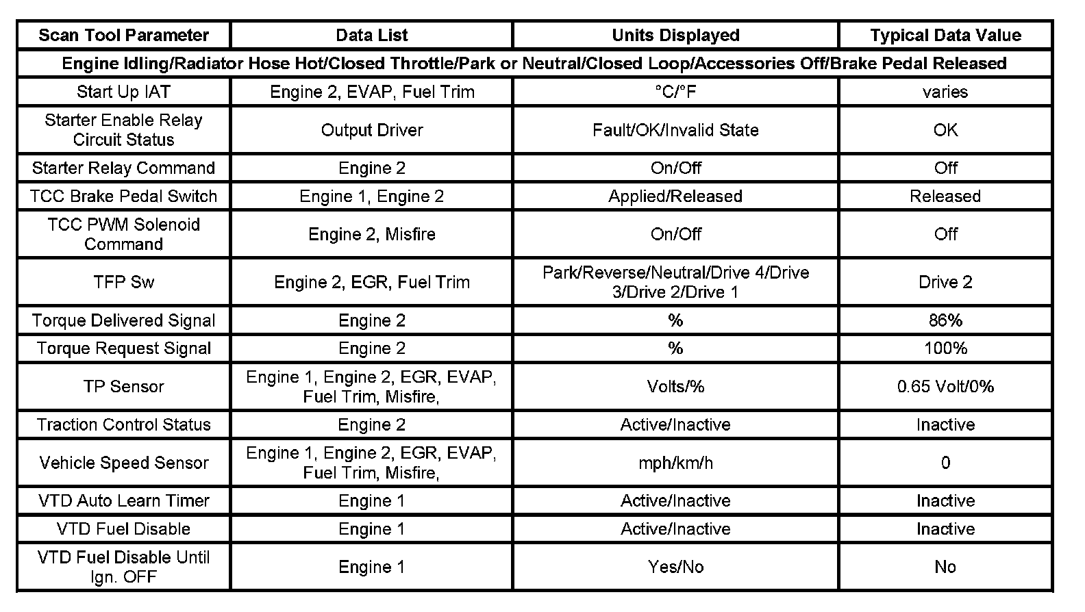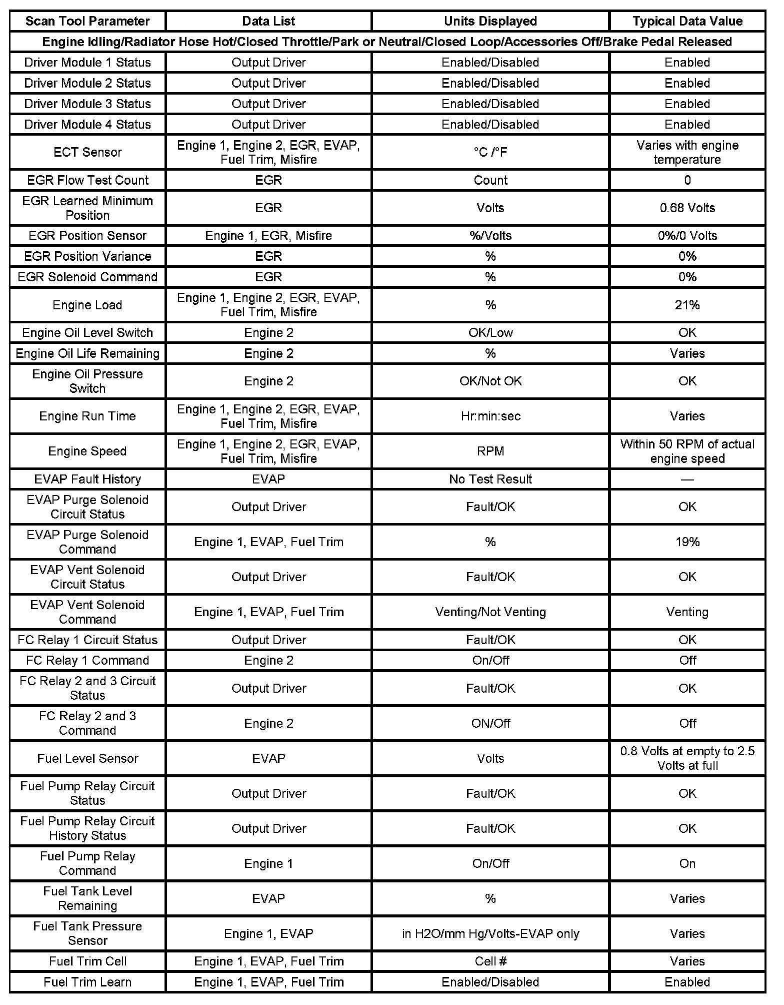 - Engine Data 1-Contains general information regarding fuel delivery, idle air control (IAC) position, heated oxygen sensor (HO2S) 1, HO2S 2, and other basic engine operating conditions.