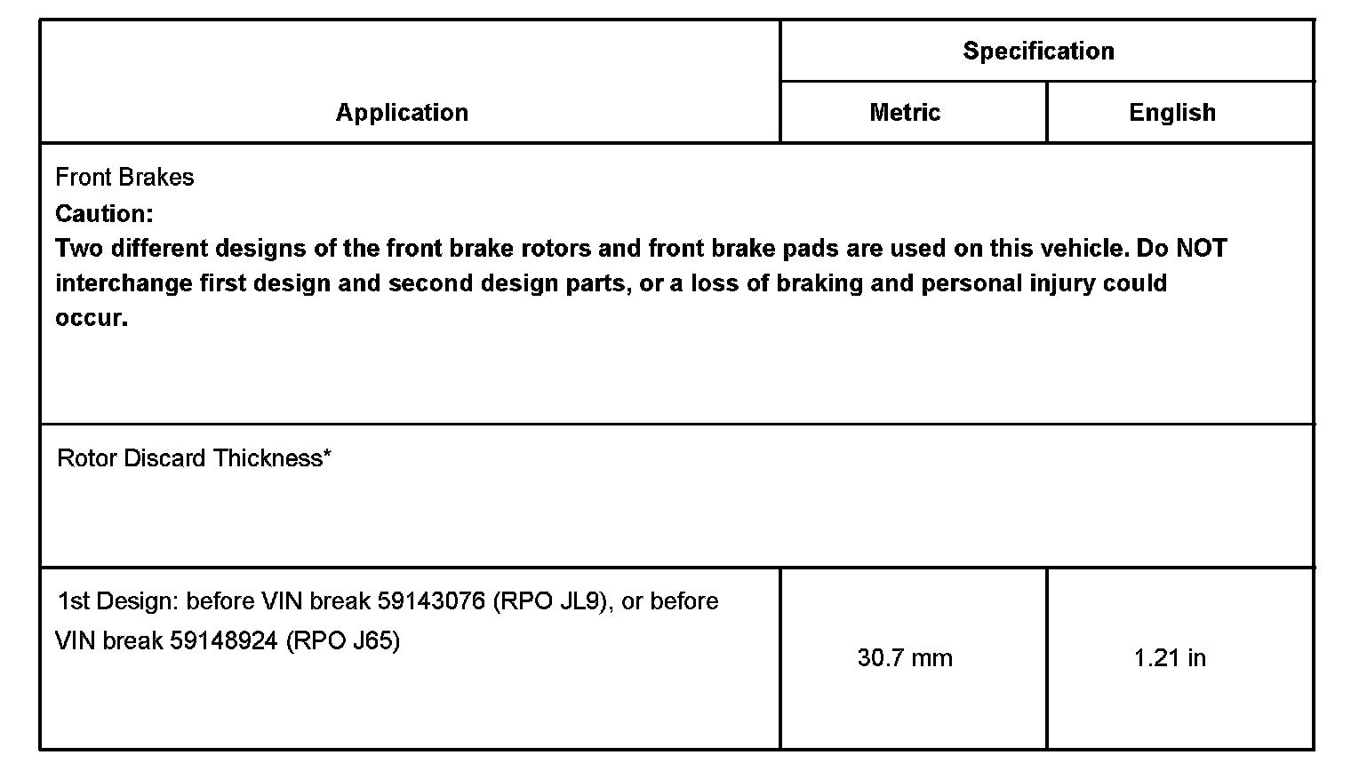 Two different designs of the front brake rotors and front brake pads are used on this vehicle. Do NOT interchange first design and second design parts, or a loss of braking and personal injury could occur.