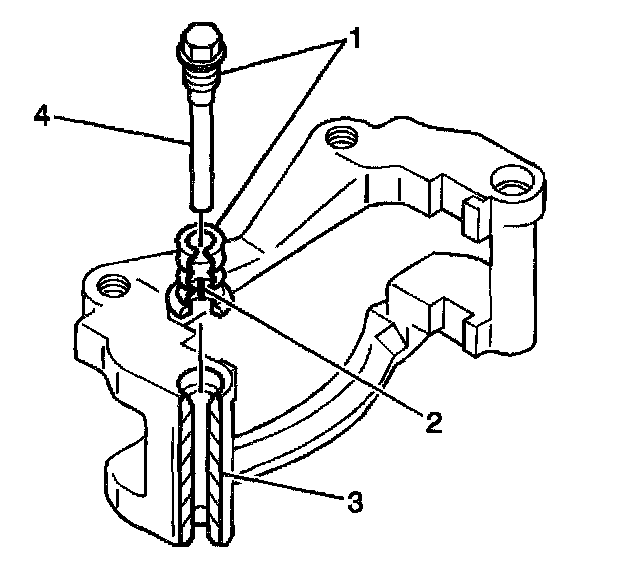 1. Lubricate the bores (3), the inside part of the bolt boot (2) and the caliper pin bolts (4) with GM P/N 18047666 or equivalent.