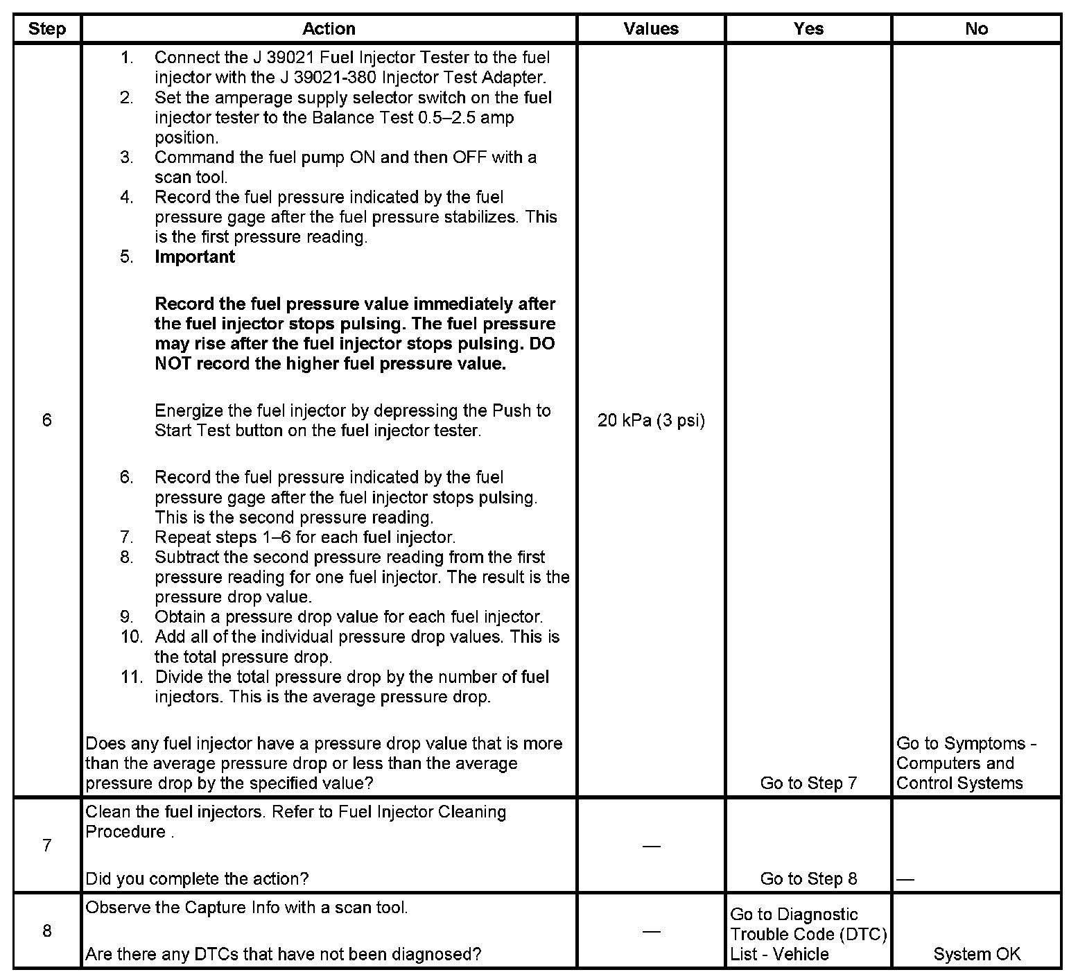 6. If the pressure drop value for each fuel injector is within 20 kPa (3 psi) of the average pressure drop value, the fuel injectors are flowing properly.