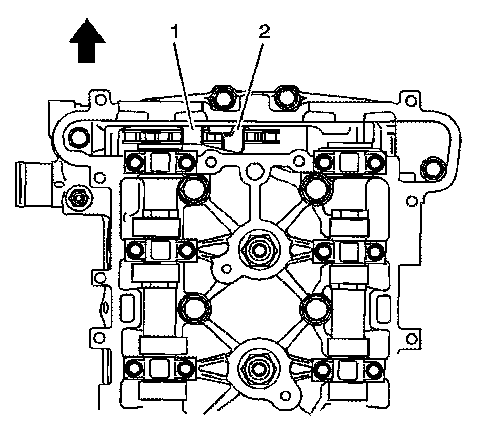 16. Lower the timing chain through the opening in the top of the cylinder head. Carefully ensure that the chain goes around both sides of the cylinder block bosses (1, 2).