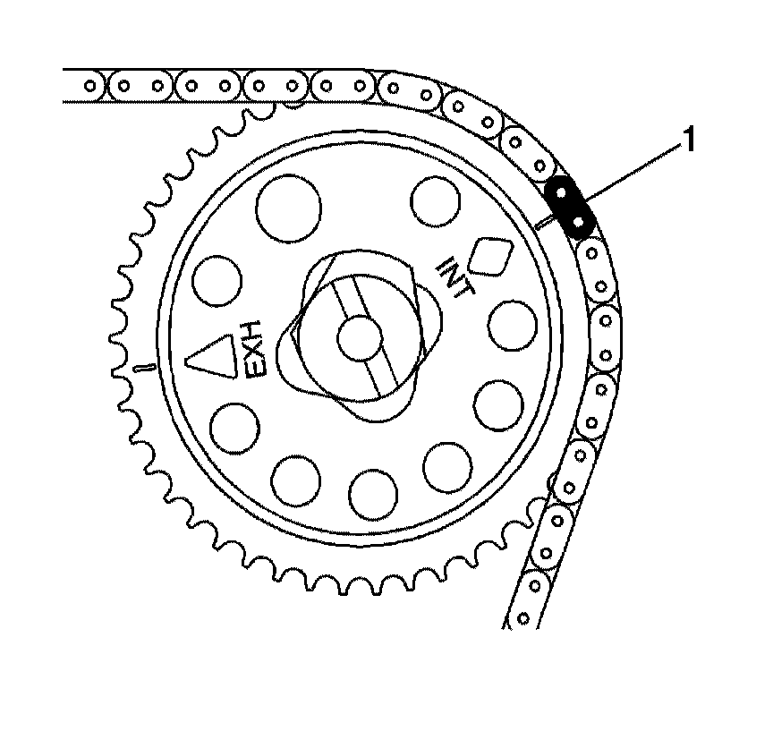 20. Route the timing chain around the intake camshaft sprocket with the uniquely colored link (1) aligning with the INT diamond.