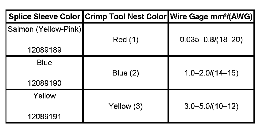 4. Select the proper duraseal splice sleeve according to the wire size. Refer to the above table at the beginning of the repair procedure for the color coding of the duraseal splice sleeves and the crimp tool nests.