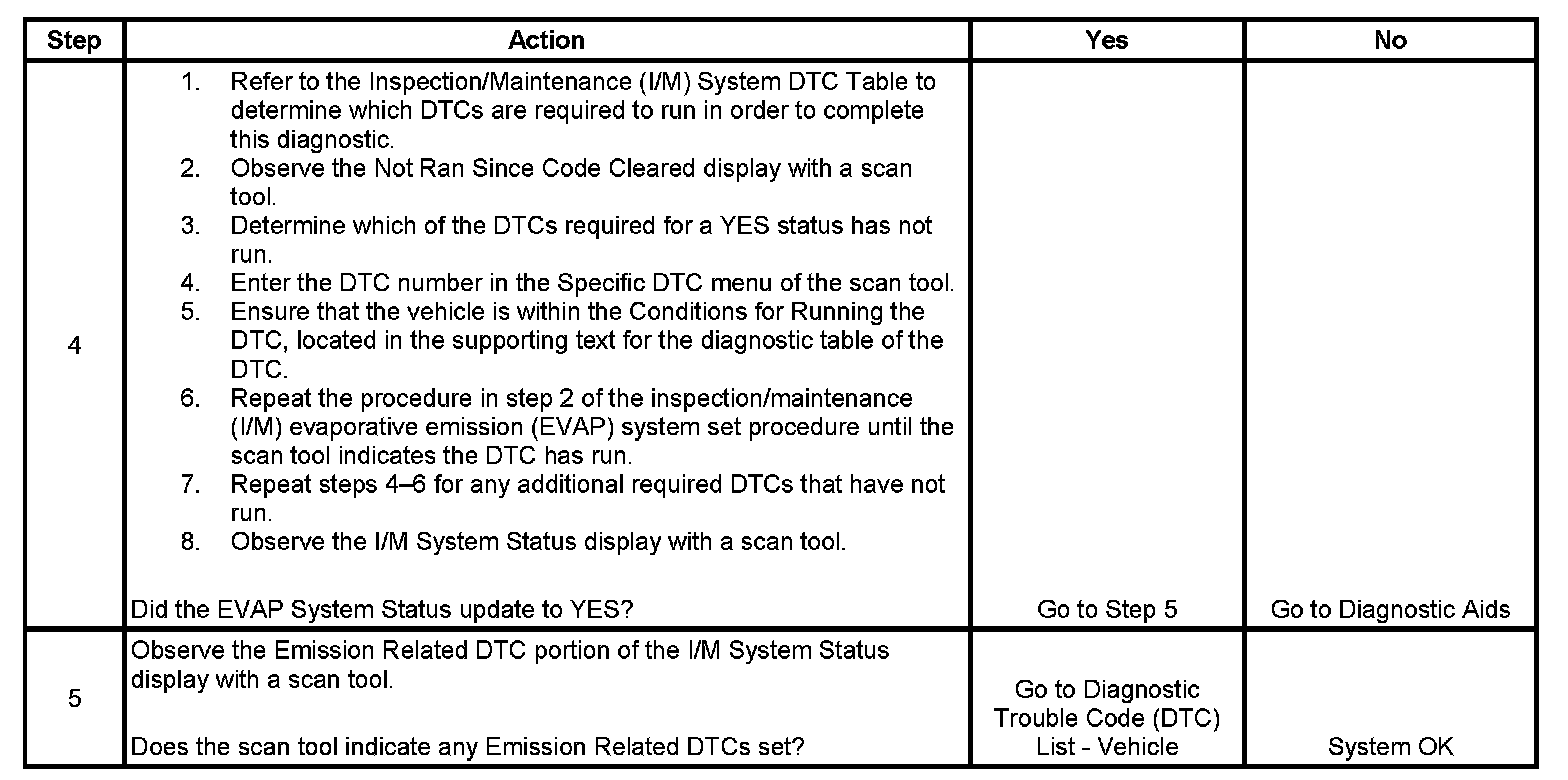 The purpose of this procedure is to satisfy the enable criteria necessary to execute inspection/maintenance (I/M) readiness diagnostics for the evaporative emission (EVAP) system. The procedure may be used to set the EVAP I/M System Status display on the scan tool to YES. The EVAP I/M System Status display indicates whether or not the control module has completed the readiness diagnostics. The readiness diagnostics complete when all DTCs comprising the diagnostics run and pass, or any DTC comprising the diagnostics illuminates the malfunction indicator lamp (MIL). If the diagnostics pass during one drive cycle, seventeen hours must elapse, regardless of whether the vehicle is driven or not. Then, the diagnostics will run again during the next drive cycle in which the conditions for running are met. Once the diagnostics have passed during the third drive cycle, the EVAP I/M System Status display will be updated to YES. A failed or aborted diagnostic will require the vehicle to cool down in order to meet the enable criteria for another drive cycle. Therefore, performing a visual inspection prior to running the EVAP test may prevent having to repeat the drive cycle.