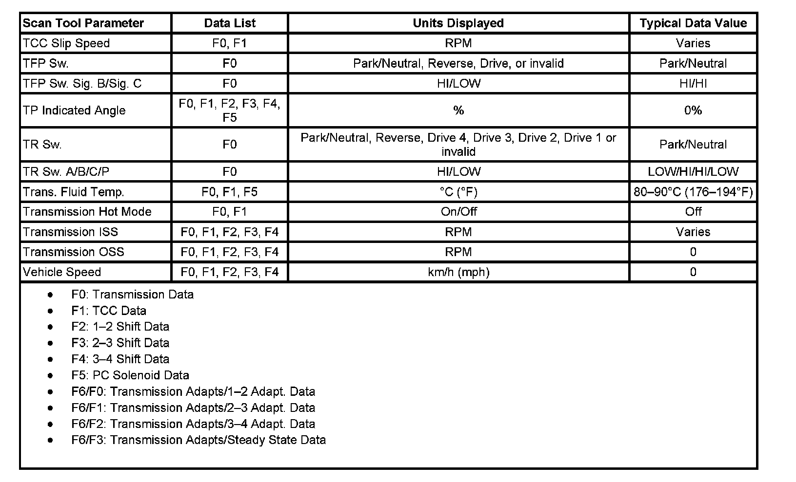 Only the parameters listed below are used in this manual for diagnosing. If a scan tool displays other parameters, the values are not recommended by General Motors for use in diagnosis.