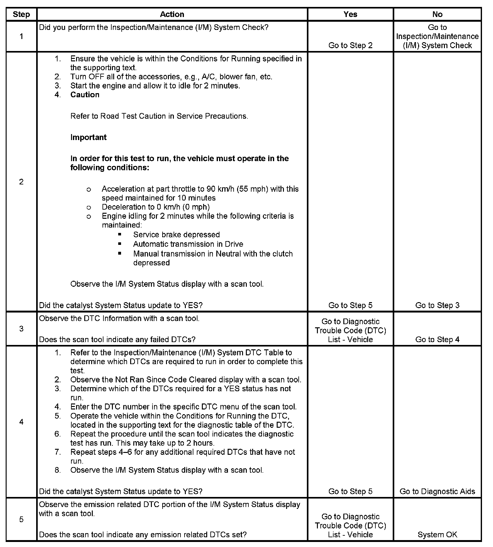 The purpose of this test is to satisfy the enable criteria necessary to execute inspection/maintenance (I/M) readiness diagnostics for the catalyst system. The test may be used to set the I/M System Status indicators to YES. The I/M System Status display on the scan tool provides an indication of whether the control module has completed the required tests. The I/M System Status does not indicate that the tests have passed or failed. When all of the diagnostics for a specific system have run and passed, the I/M System Status will update to YES. If a test for a specific system has failed, the I/M System Status will update to YES, indicating a determination was made even if all of the other tests for that system have not run.