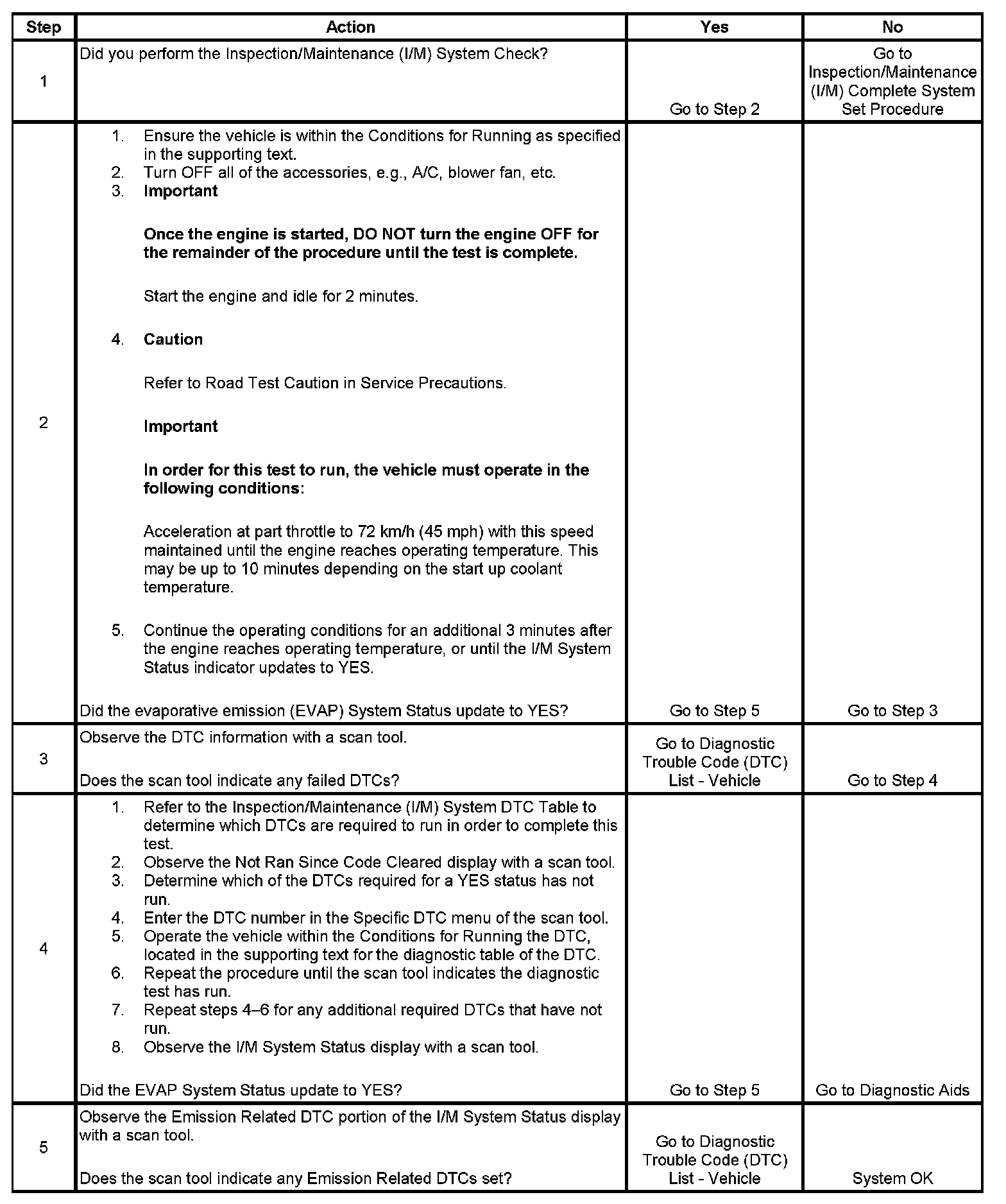 The purpose of this test is to satisfy the enable criteria necessary to execute inspection/maintenance (I/M) readiness diagnostics for the evaporative emission (EVAP) system. The test may be used to set the I/M System Status indicators to YES. The I/M System Status display on the scan tool provides an indication of when the control module has completed the required tests. The I/M System Status does not indicate that the tests have passed or failed. When all of the diagnostics for a specific system have run and passed, the I/M System Status will update to YES. If a test for a specific system has failed, the I/M System Status will update to YES, indicating a determination was made, even if all of the other tests for that system have not run. Performing a visual inspection prior to running the EVAP test may prevent having to repeat the test. A failed or aborted test will require the vehicle to cool down in order to meet the enable criteria to run another test.