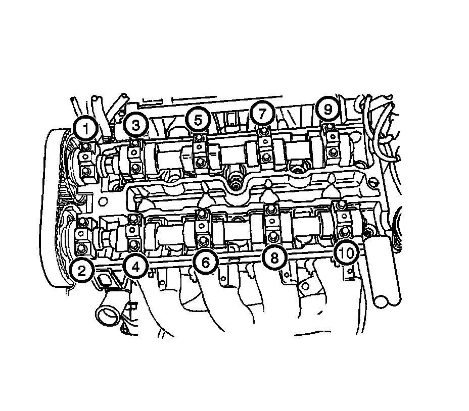 1. Tighten the camshaft bearing cap bolts gradually and in sequence shown for each camshaft cap.