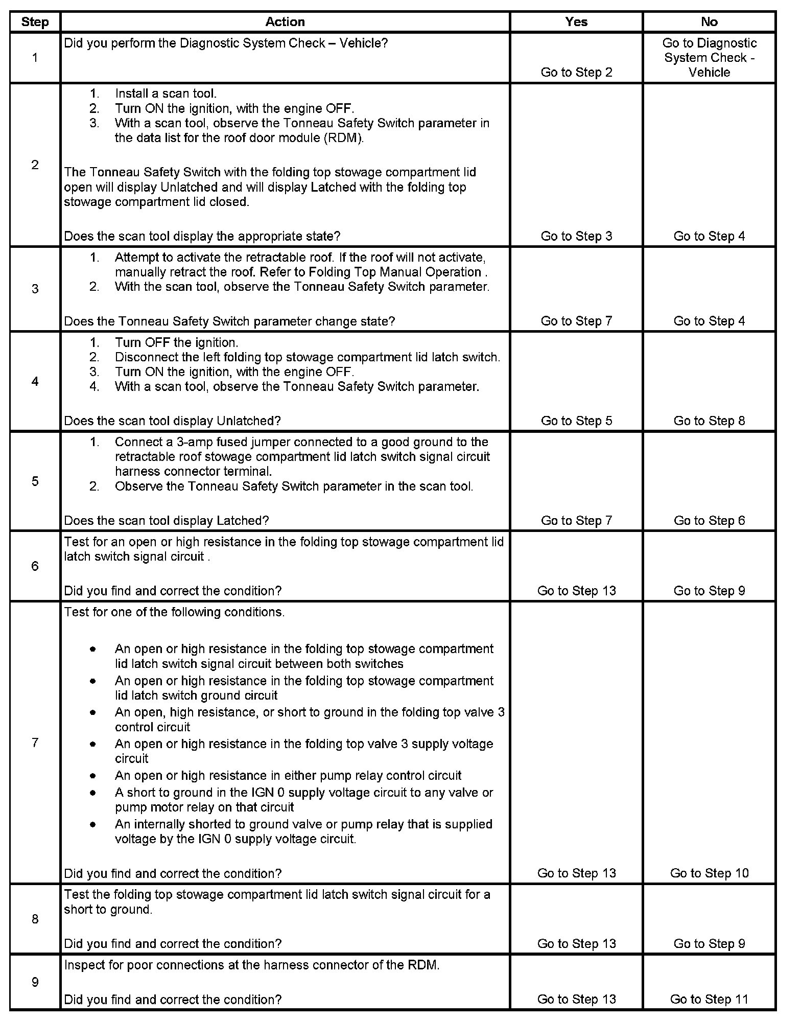 - An open or high resistance exists in the folding top stowage compartment lid latch switch signal circuit or ground circuit.