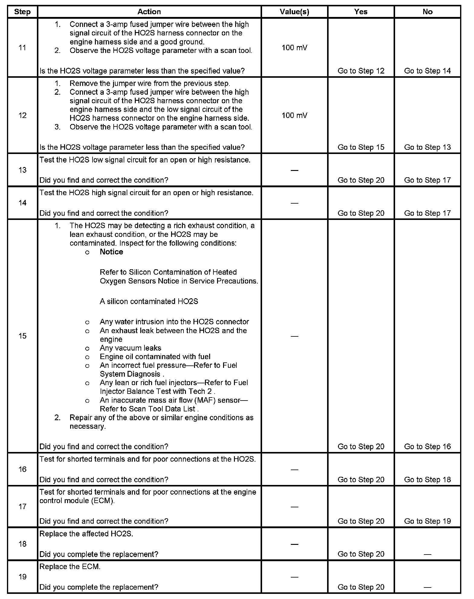 - The ECM detects that the HO2S bank 1 sensor 2 or HO2S bank 2 sensor 2 is less than 710 mV for 60 seconds.