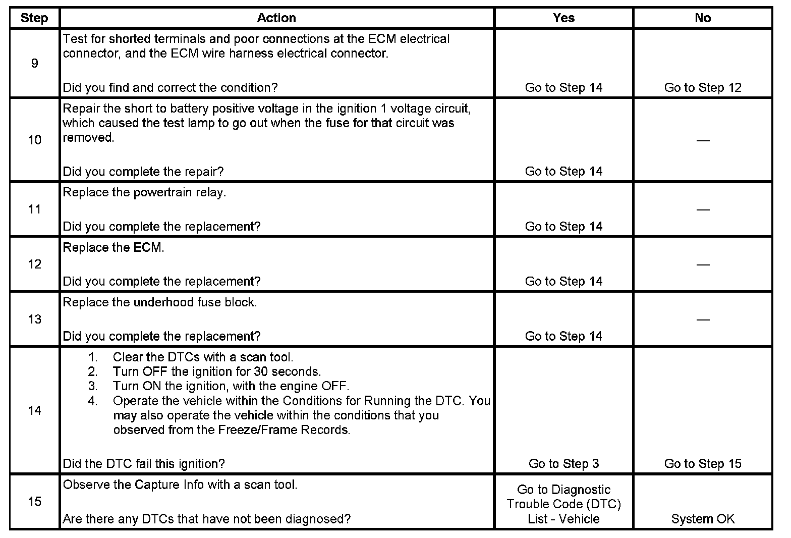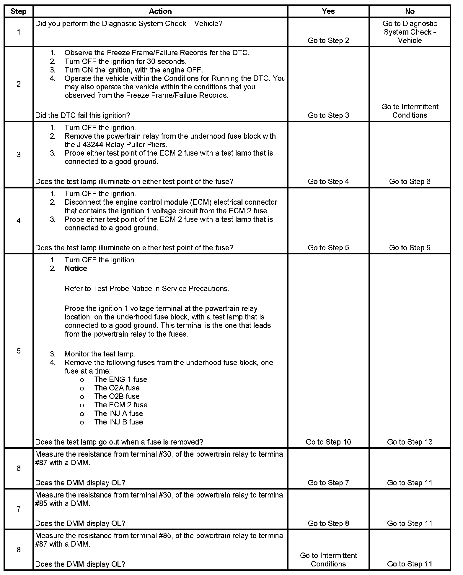 The powertrain relay is a normally open relay. The relay armature is held in the open position by spring tension. Battery positive voltage is supplied directly to the relay coil and the armature contact at all times. The engine control module (ECM) supplies the ground path to the relay coil control circuit via an internal integrated circuit called an output driver module (ODM). When the ECM commands the powertrain relay ON, ignition 1 voltage is supplied to the ECM through the ECM 2 fuse in the underhood fuse block. The ignition 1 voltage input to the ECM provides the ignition power for the throttle actuator control (TAC) circuitry, and is also used to confirm that the powertrain relay has closed. This DTC will set when the ECM detects more than 2 volts on the ignition 1 voltage circuit to the ECM, after the ignition switch is turned OFF. DTC P0690 indicates a short to battery positive voltage in the ignition 1 voltage circuit to the ECM.