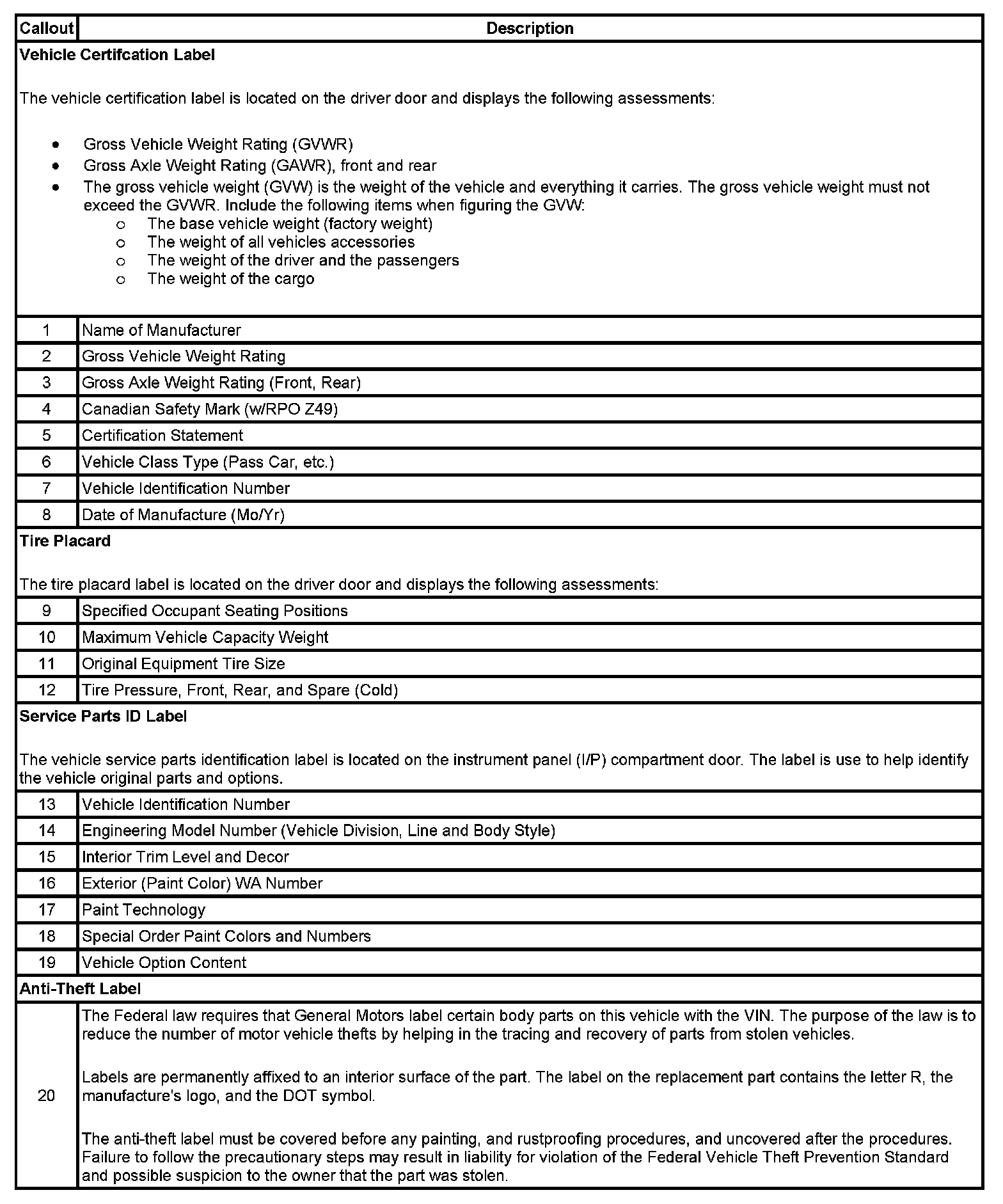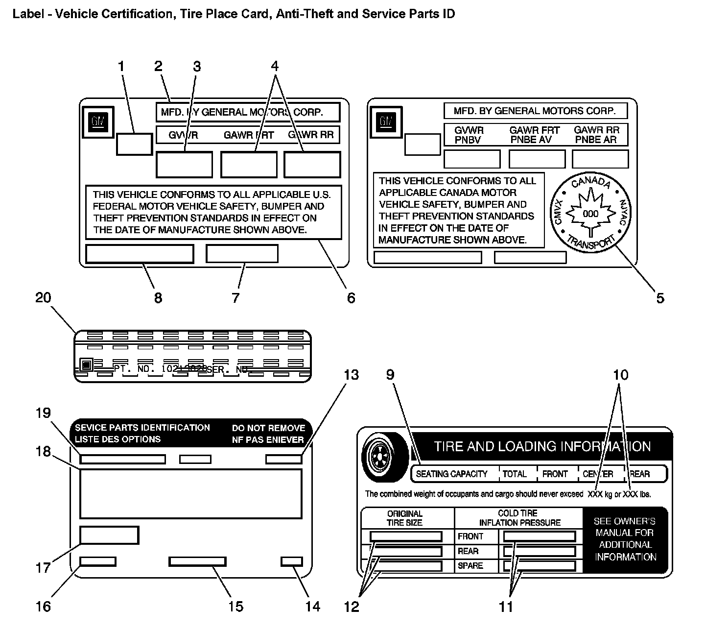 Label - Vehicle Certification, Tire Place Card, Anti-Theft and Service Parts ID:
