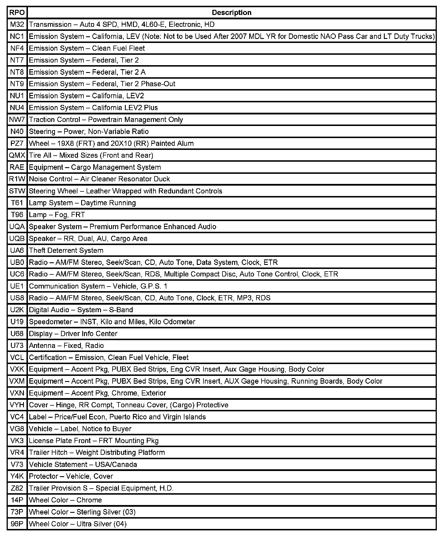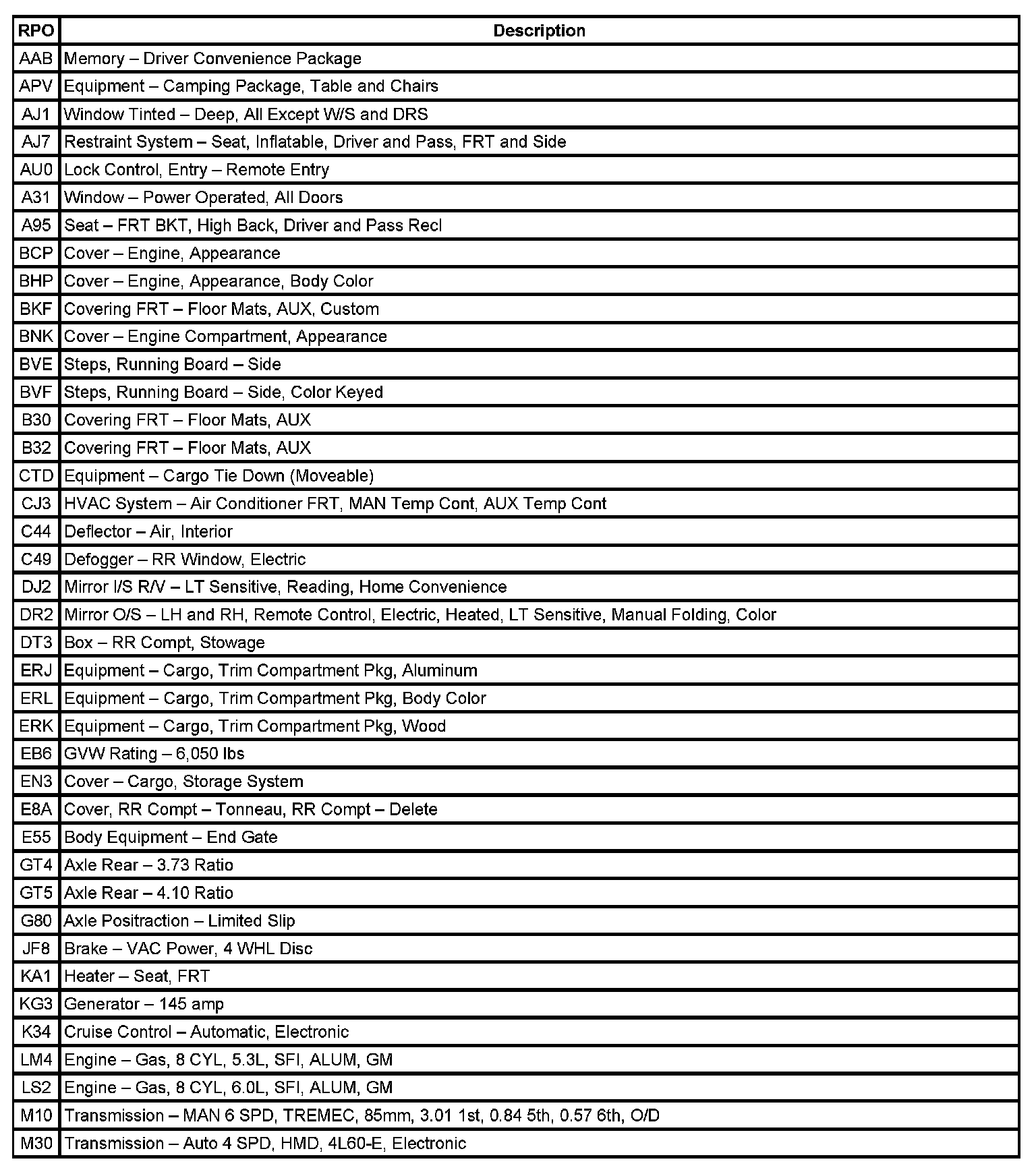 RPO Code List Part 1: