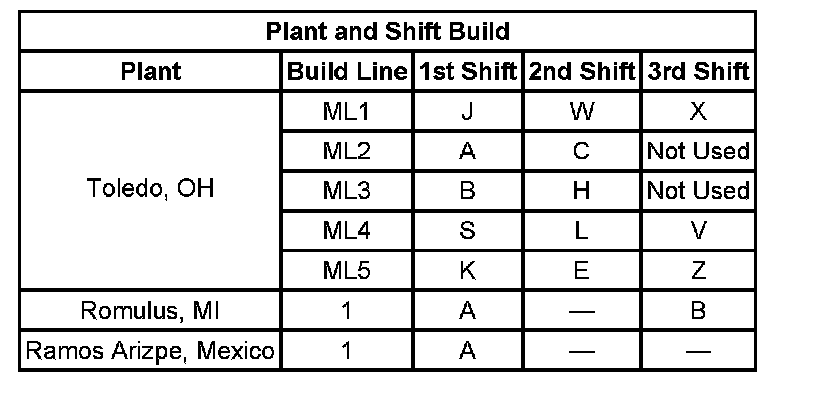 12 - Build Location Y = Toledo, OH, R = Romulus, MI, 4 = Ramos Arizpe, Mexico